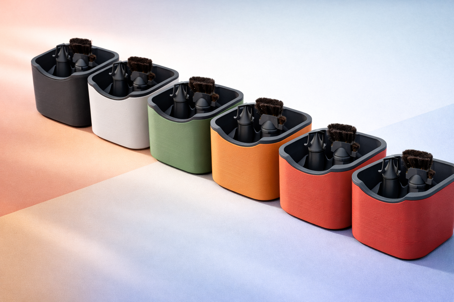 We're changing that. Our electric cleaner uses a rotor & brush to reset your portafilter in seconds. No knocking. No wiping. Just a perfectly clean basket, ready for the next extraction.